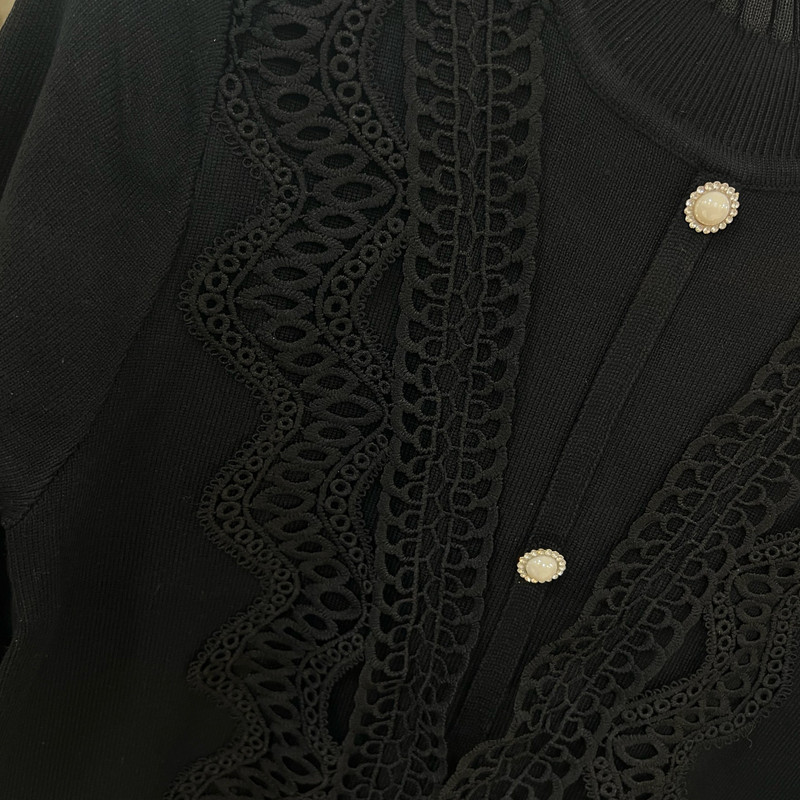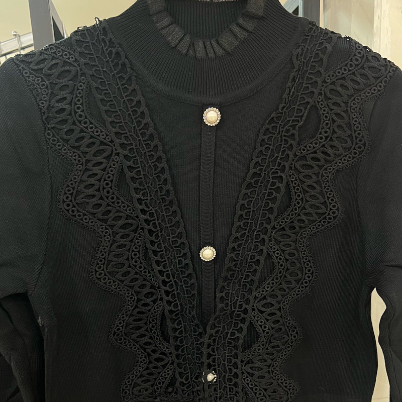 پیراهن بافت مجلسی یقهاسکی زنانه، با زمینهی مشکی و بافت ریز و یکدست، دارای یقهاسکی ایستاده با چین ظریف در لبهی یقه است. قسمت جلوی پیراهن با نوارهای گیپور با طرح موجدار و دو ردیف تزیینات دانتلدوزی، بههمراه سه دکمهی مرواریدی تزیینی، آراسته شده و ظاهری کلاسیک و رسمی ایجاد میکند. کمر لباس به وسیلهی بند قابل تنظیم، فرم بدن را مرتب و شیک نشان میدهد و دامن با برش ملایم کلوش تا روی زانو امتداد مییابد. این لباس با آستینهای بلند و سرآستینهای بافت کشباف، گزینهای مناسب برای مهمانیهای رسمی، مجالس و استفادهی روزمرهی شیک در فصول خنک سال است.