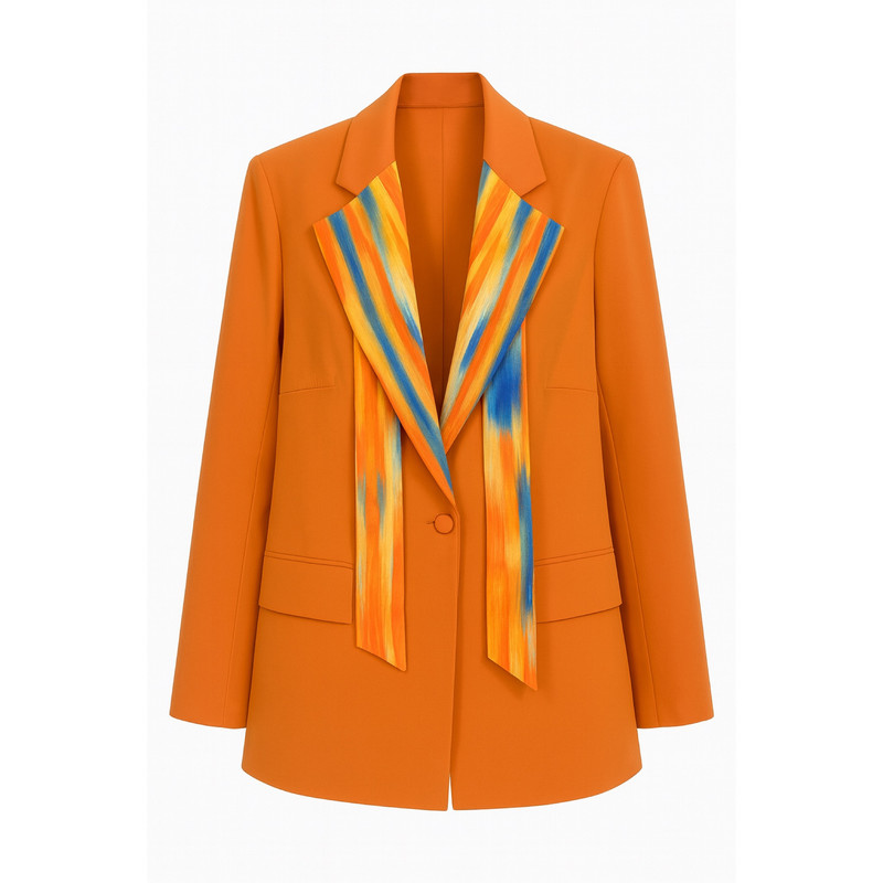 این ست کت و شلوار زنانه با طراحی معاصر و دوخت کاملاً رسمی، از پارچهای باکیفیت و خوشفرم تهیه شده و بهصورت یکدست واحد قابل استفاده در مجالس رسمی، محیطهای کاری و میهمانیهای سطح بالا است. ترکیب رنگ مشکی خالص بهعنوان رنگ پایه، در کنار نقوش آبی با طرح ماربل در یقه کت و بخش جلویی آن، جلوهای متمایز، شیک و در عین حال کاملاً آراسته ایجاد کرده است. نکته حائز اهمیت آنکه کراوات متصل به کت قابل جدا شدن بوده و با توجه به سلیقه و نوع مجلس، امکان استفاده از کت بهصورت ساده یا همراه با کراوات فراهم است. فرم کت، تنخور نیمهفیت با قد میانی و یقه برگردان پهن دارد و شلوار با برش راسته و اندکی گشاد، ضمن ایجاد ظاهری کشیده و شیک، راحتی مطلوب در زمان استفاده را فراهم میآورد.