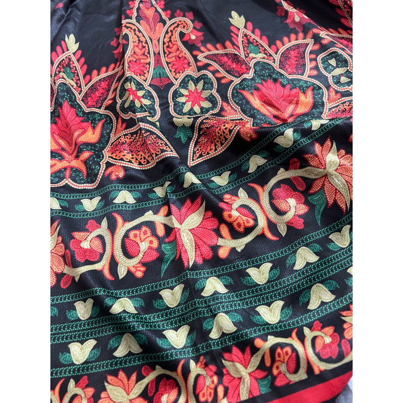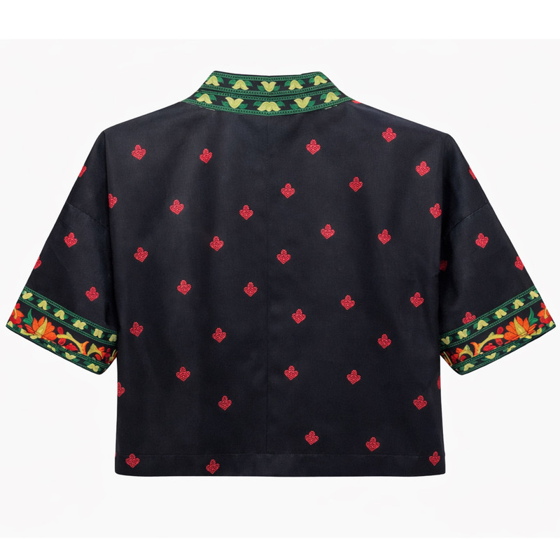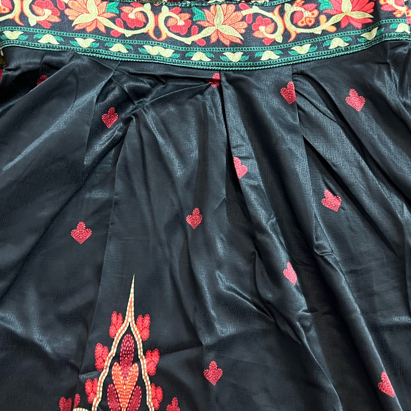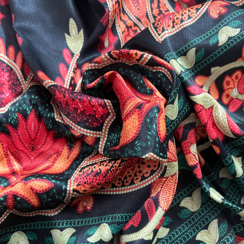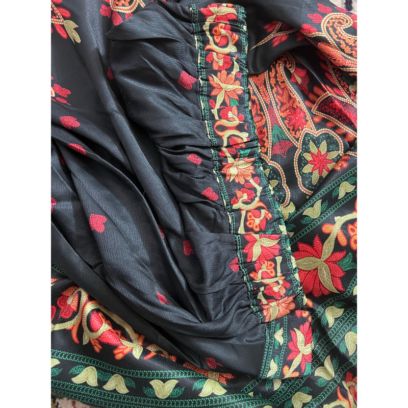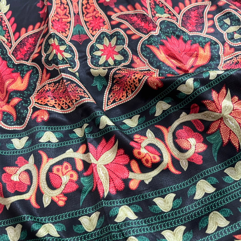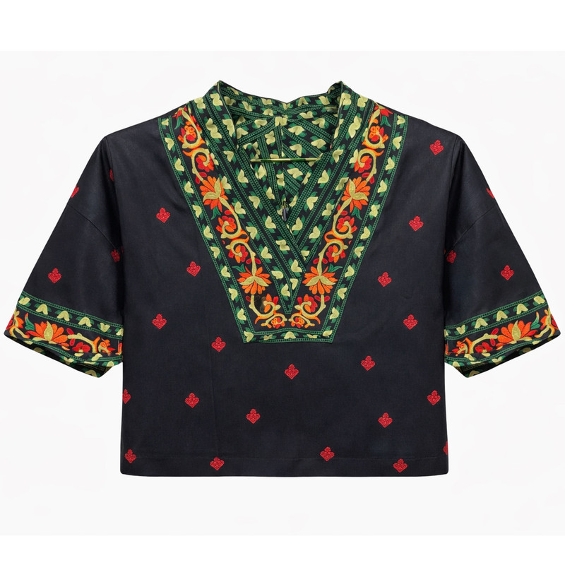 این ست دوتکه زنانه با زمینه تیره و نقوش سنتی پرجزئیات، انتخابی بسیار شیک و متمایز برای بانوانی است که به استایلهای اصیل، هنری و در عین حال چشمگیر علاقه دارند. بلوز کوتاه با یقه هفت و حاشیههای طرحدار الهامگرفته از نقوش سنتی، جلوهای خاص و ظریف به بالاتنه میبخشد و در کنار دامن بلند و چیندار، ترکیبی هماهنگ، فاخر و بسیار خوشفرم ایجاد میکند. تضاد رنگی میان زمینه مشکی و طرحهای گرم و زنده، باعث شده این ست جلوهای لوکس و متفاوت روی تن داشته باشد.